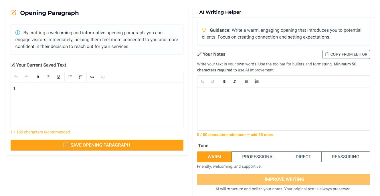 We’re introducing a new AI writing assistant to help you build and improve your Counselling.Network profile — designed specifically to support you when you need it, and stay out of the way when you don’t.